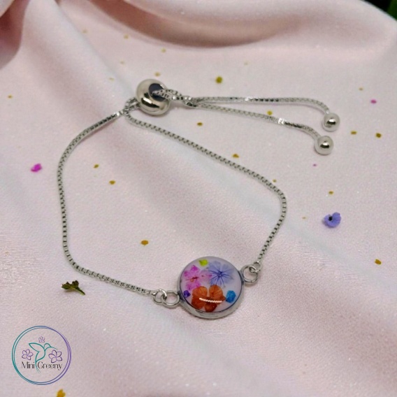 Ta wyjątkowa bransoletka łączy w sobie naturalne piękno i elegancję. W centralnym medalionie zatopione zostały prawdziwe, suszone mini kwiatuszki w pastelowych odcieniach, które pięknie prezentują się na jasnym tle. Tworzą subtelną, harmonijną kompozycję przypominającą miniaturowy ogród zamknięty w żywicy.