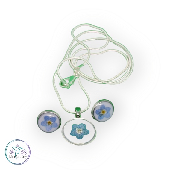 Wyjątkowy komplet biżuterii składający się z naszyjnika i kolczyków typu wkrętki, wykonany z prawdziwych niezapominajek zatopionych w żywicy. Ten subtelny zestaw to doskonałe połączenie natury, delikatności i ponadczasowej elegancji.