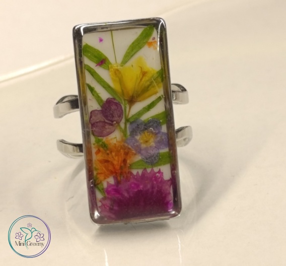 Regulowany pierścionek z kolorowymi kwiatami w żywicy – miniaturowy ogród na Twojej dłoni