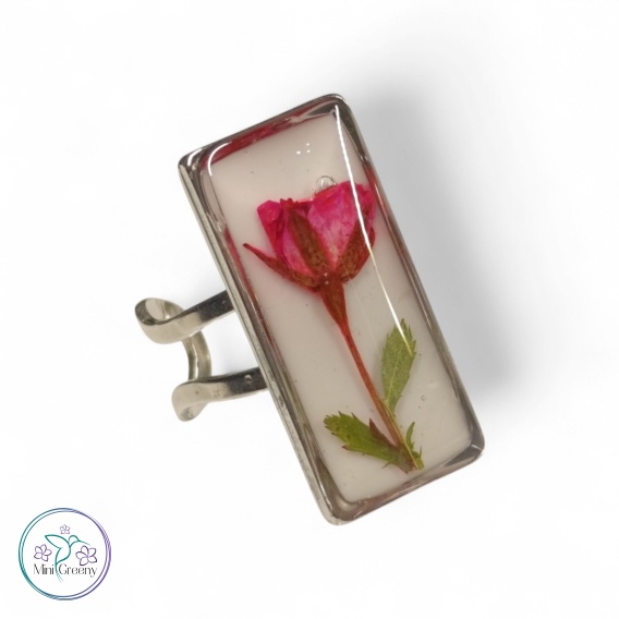 Regulowany pierścionek z pąkiem róży w żywicy – subtelna elegancja natury